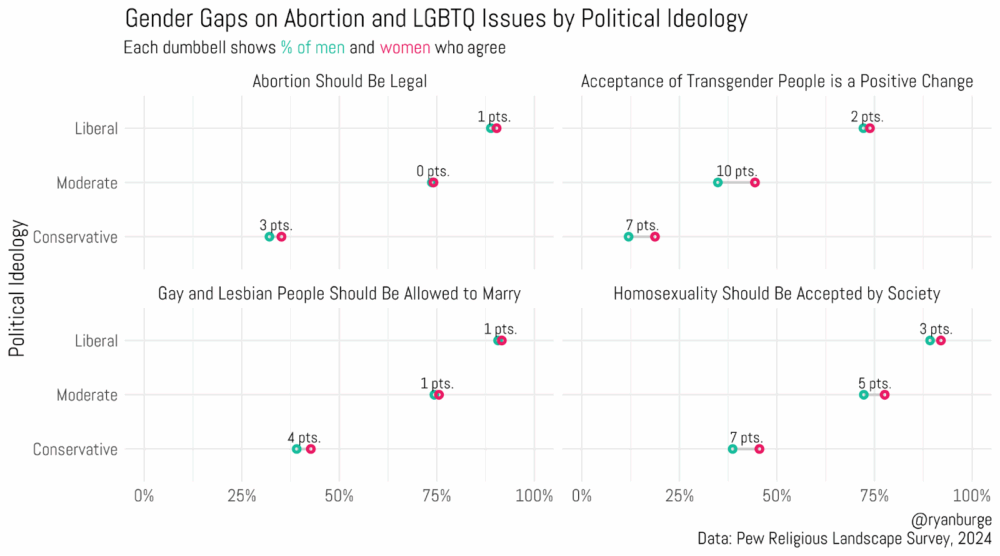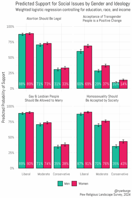 - However, as the last graph shows us, ideology can’t close the gender gap entirely. On the issues of the trans community, men are just less accepting. That’s true when comparing liberals to liberals and conservatives to conservatives. They are also less accepting of homosexuality, too.