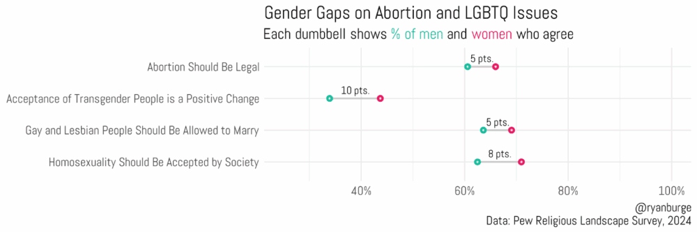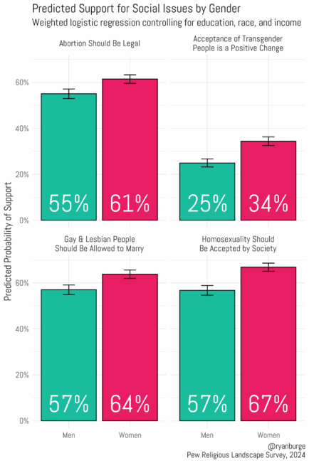 Yeah, okay—I think this gives me a lot more confidence in saying that women, on average, are more socially permissive than men. On the topic of abortion, the model predicts that 61 percent of women favor legal access compared to 55 percent of men. Interestingly, that 6-point gap is the smallest gender gap of any of these four issues. On the acceptance of trans people, women are 9 points more supportive. When it comes to questions of LGBTQ+ community, women are 7 points more likely to support same-sex marriage and 10 points more apt to express agreement that homosexuality should be accepted by society.