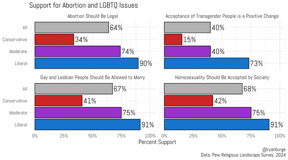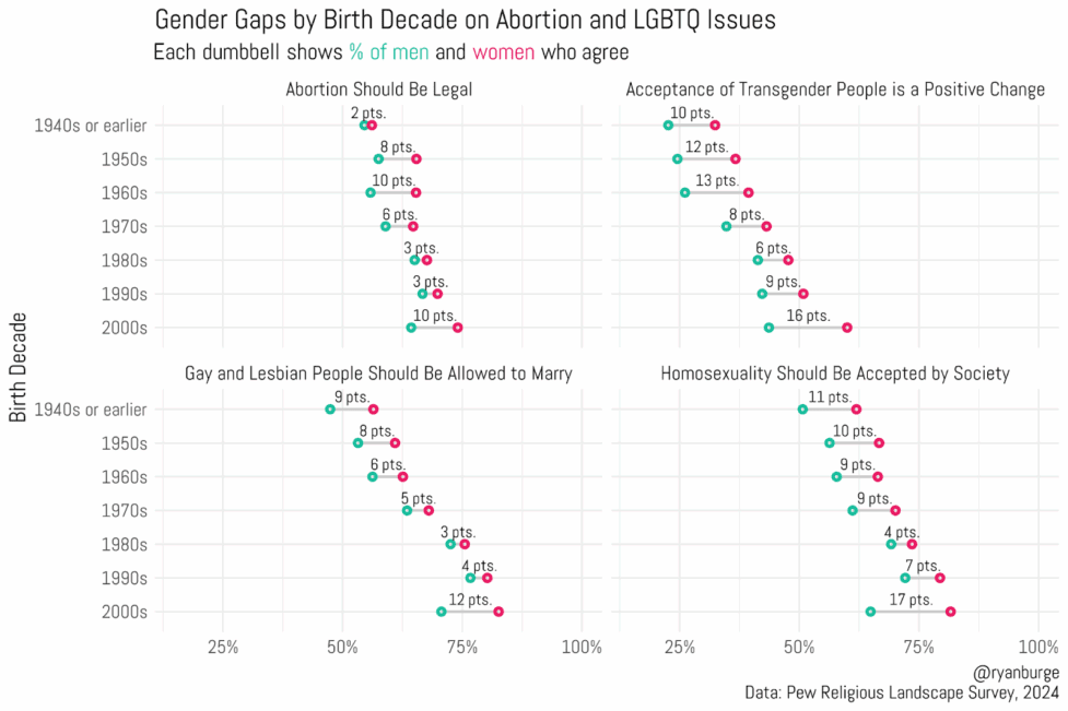 Let me start off by saying that I got the inspiration for this data exercise from reading Dan Cox’s excellent newsletter American Storylines. It was specifically his post from March 20, “The Gender Gap in Church is Growing.” Dan took from the Pew Religious Landscape study four questions that focused on social issues and demonstrated how young Christian men and young Christian women have differing views on abortion and LGBTQ+ topics. What he uncovered was that Christian women aged 18-24 are significantly more progressive on each issue compared to men of the same age. For instance, 54 percent of the female sample said that “acceptance of transgender people is a positive change.” It was only 29 percent of the male sample. That’s not a small gap! It’s a chasm, really.