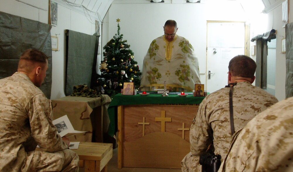 Bartz sees a silver lining here for priests. Freed from the concerns of running a territorial parish, the military chaplain is to some extent the captain of his own ship. Paradoxically, because customization is off the table, the priest and parishioners are less susceptible to timesucking distractions like disagreements over where to place the flowers on the altar (a longstanding debate of Greek Orthodox practice). Instead, when everyone shows up to pray, they “worship together, and all that stuff kind of disappears,” Bartz said.